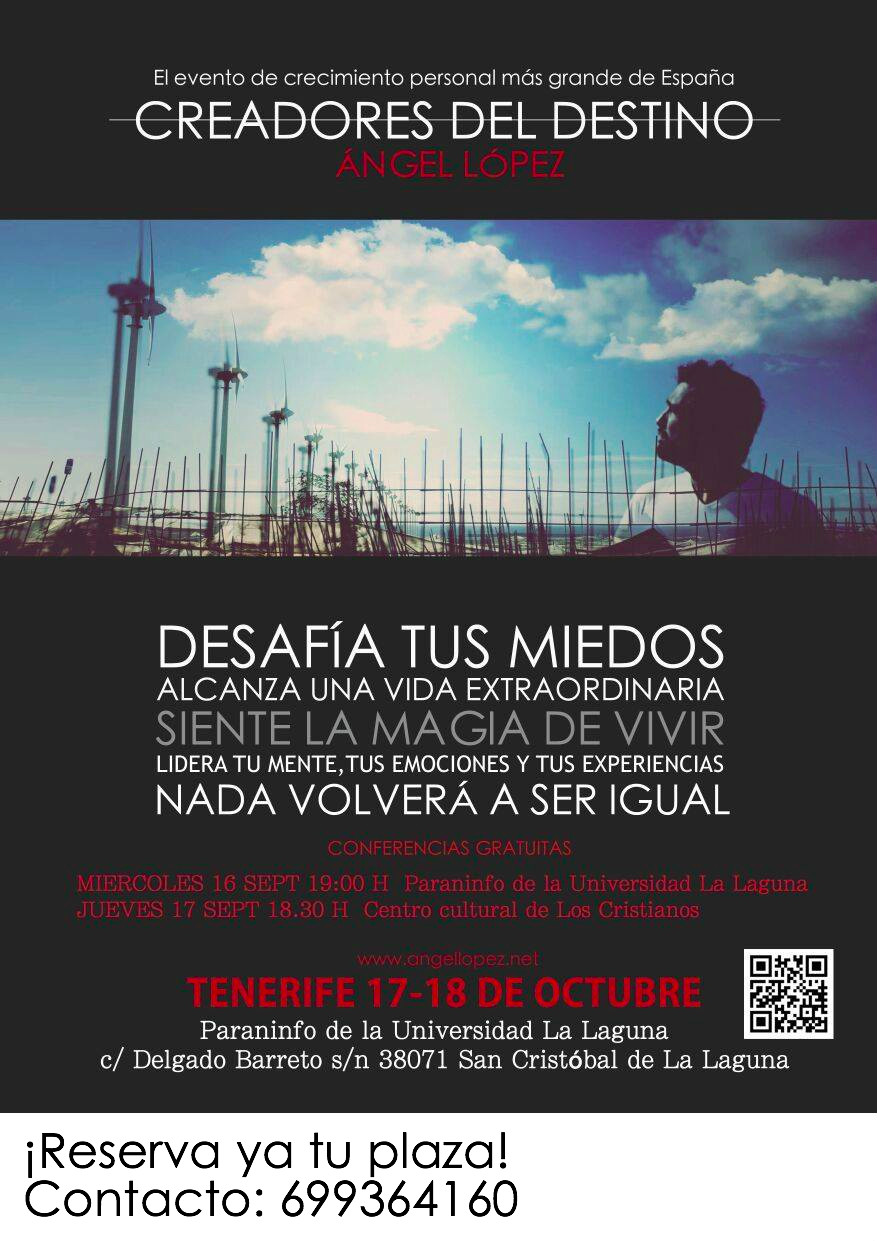 El mayor evento de crecimiento personal en España llega a Tenerife y ya podemos confirmar fechas, su conductor Ángel López ha anunciado que vuelve a Canarias. Estará en la isla de Tenerife en conferencias gratuitas los días 16 y 17 de Septiembre y en el mes de Octubre los días 17 y 18, en Paraninfo de la Universidad La Laguna con el gran evento “Creadores del Destino”.