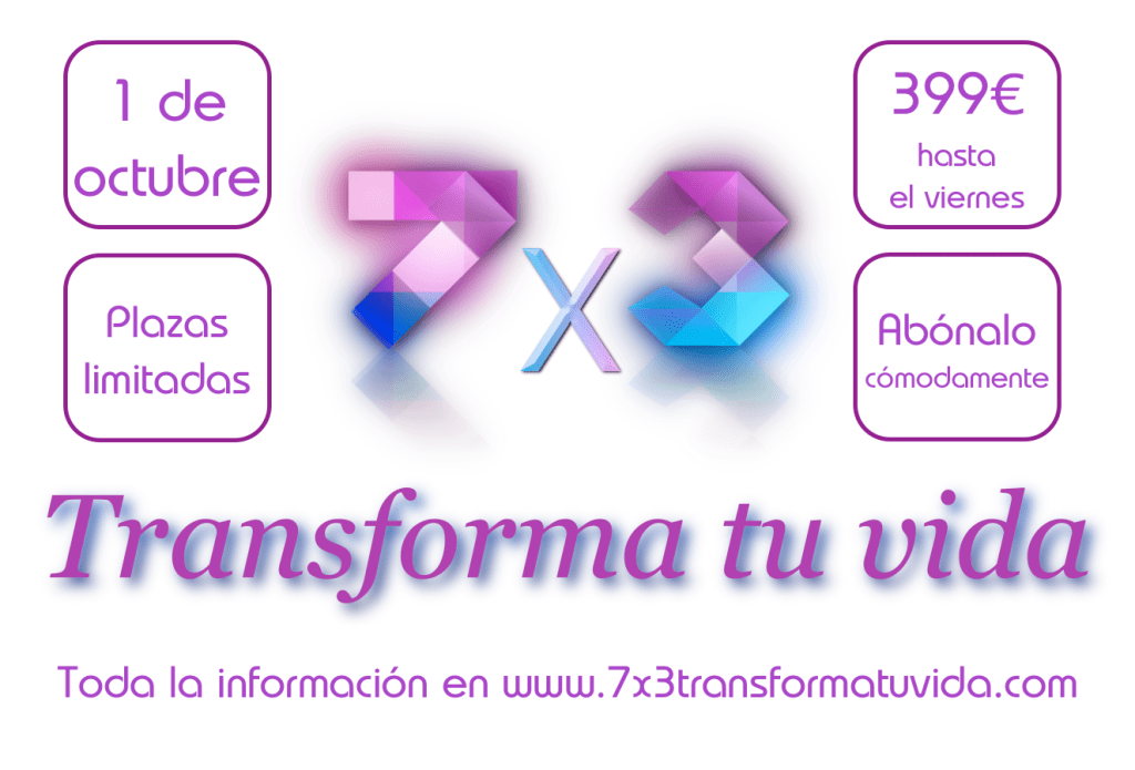 7×3 es un proyecto que tiene como fin ayudar a las personas a que transformen su vida en positivo, que puedan adquirir hábitos que les hagan más felices, que gestionen sus emociones y relaciones, así como comportamientos saludables o que sepan cómo encarar sus objetivos. No se trata sólo de un curso presencial. Su formato te garantiza atención personalizada durante todo el proceso, no sólo con la solución de dudas, sino que también ofrece un seguimiento a través de foros online y tutorías grupales semanales a través de internet.