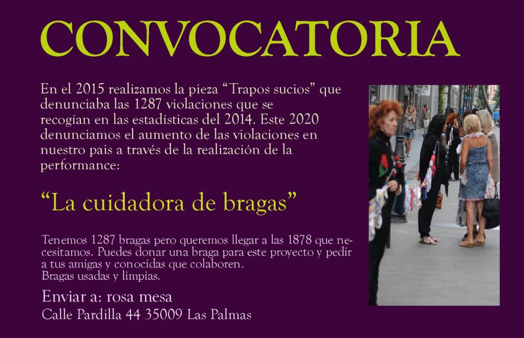 Rosa Mesa ha realizado el Máster Universitario en Gestión del Patrimonio Artístico y Arquitectónico, Museos y Mercado del Arte. Hablaremos sobre la próxima convocatoria de «La cuidadora de Bragas», una performance que denuncia el aumento de violaciones a mujeres en nuestro país. Si quieres colaborar aquí te dejamos toda la información.