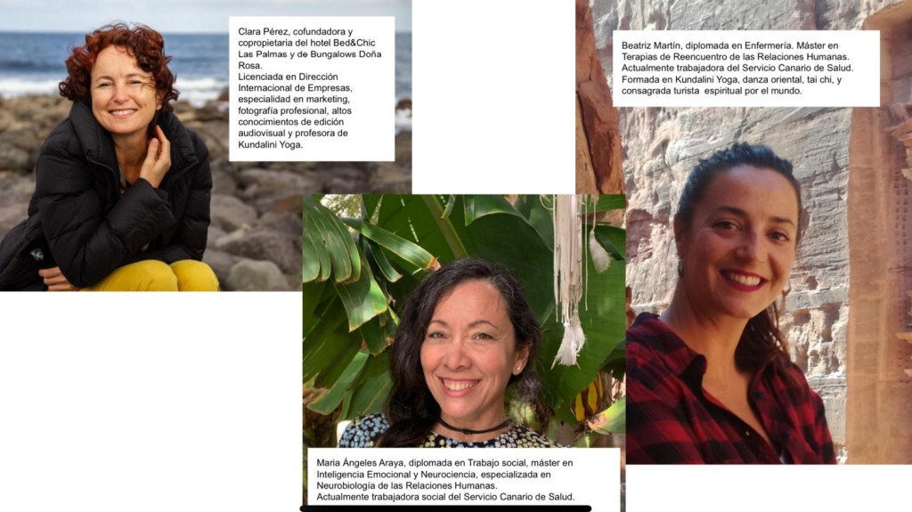 Han estado con nosotros Clara Pérez, cofundadora y copropietaria del hotel Bed&chic Las Palmas y de bungalows Doña Rosa. Licenciada en dirección internacional de empresas, especialidad en marketing, fotografía professional, altos conocimientos de edición audiovisual y profesora de kundalini yoga. Y Beatriz Martin diplomada en enfermería , master en terapias de reencuentro de las relaciones humanas. Actualmente es trabajadora del servicio canario de salud. Formada en kundalini yoga, danza oriental, tai chi y consagrada turista spiritual por el mundo.