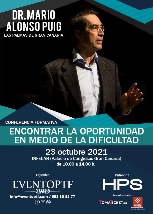 Estamos muy felices de poder contar en el programa con el Dr. Mario Alonso Puig. Es médico, fellow en cirugía por Harvard University Medical School y ha dedicado gran parte de su vida a investigar cómo desplegar el potencial humano, especialmente en momentos de desafío, incertidumbre y cambio. Lleva más de 20 años impartiendo cursos, conferencias y trabajando con equipos directivos para potenciar capacidades humanas como el: liderazgo, trabajo en equipo, gestión del cambio, salud, bienestar, felicidad, comunicación, creatividad e innovación. Estará el próximo 23 de octubre en Gran canaria con la conferencia «ENCONTRAR LA OPORTUNIDAD EN MEDIO DE LA DIFICULTAD»