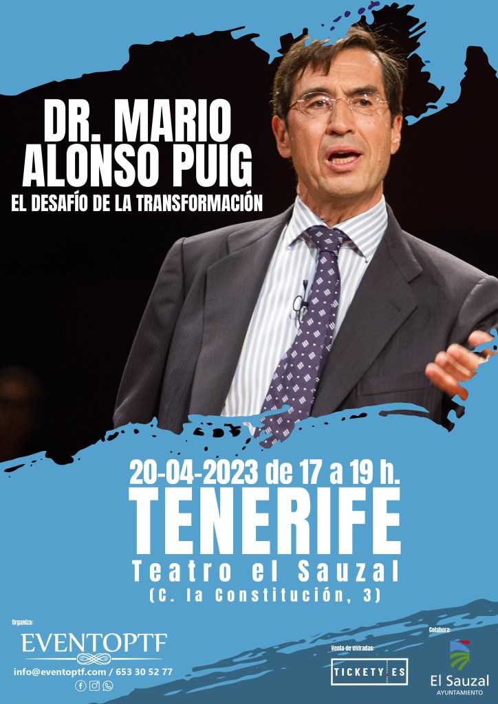 Estará el próximo 20 de abril en Tenerife con la conferencia «EL DESAFÍO DE LA TRANSFORMACIÓN» en el Teatro El Sauzal de 17:00 a 19:00 h.